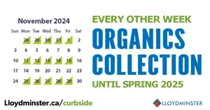 The City of Lloydminster advises residents that starting October 28, 2024, the City will pick up green-cart organics every other week. After the initial pickup on October 28, 2024, the next collection will be on November 11, 2024, with this bi-weekly schedule continuing until Spring 2025.